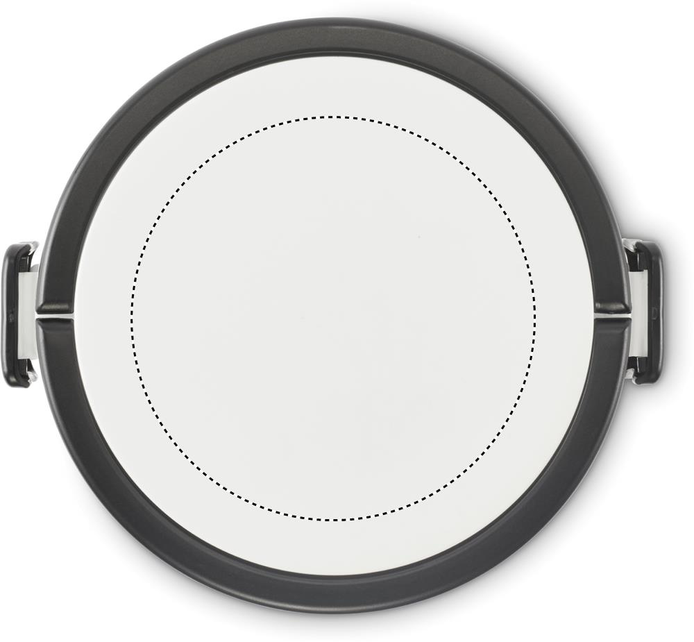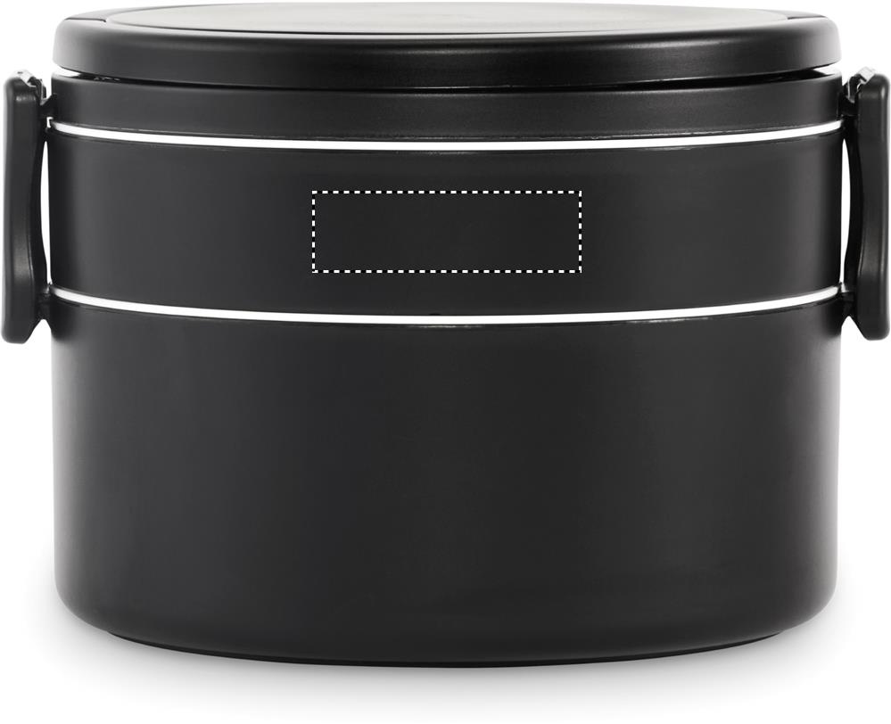 Two-tier round lunch box made of PP with side clip closure and handles. Includes inner lids in white. Capacity 250 ml top, 700 ml bottom.
