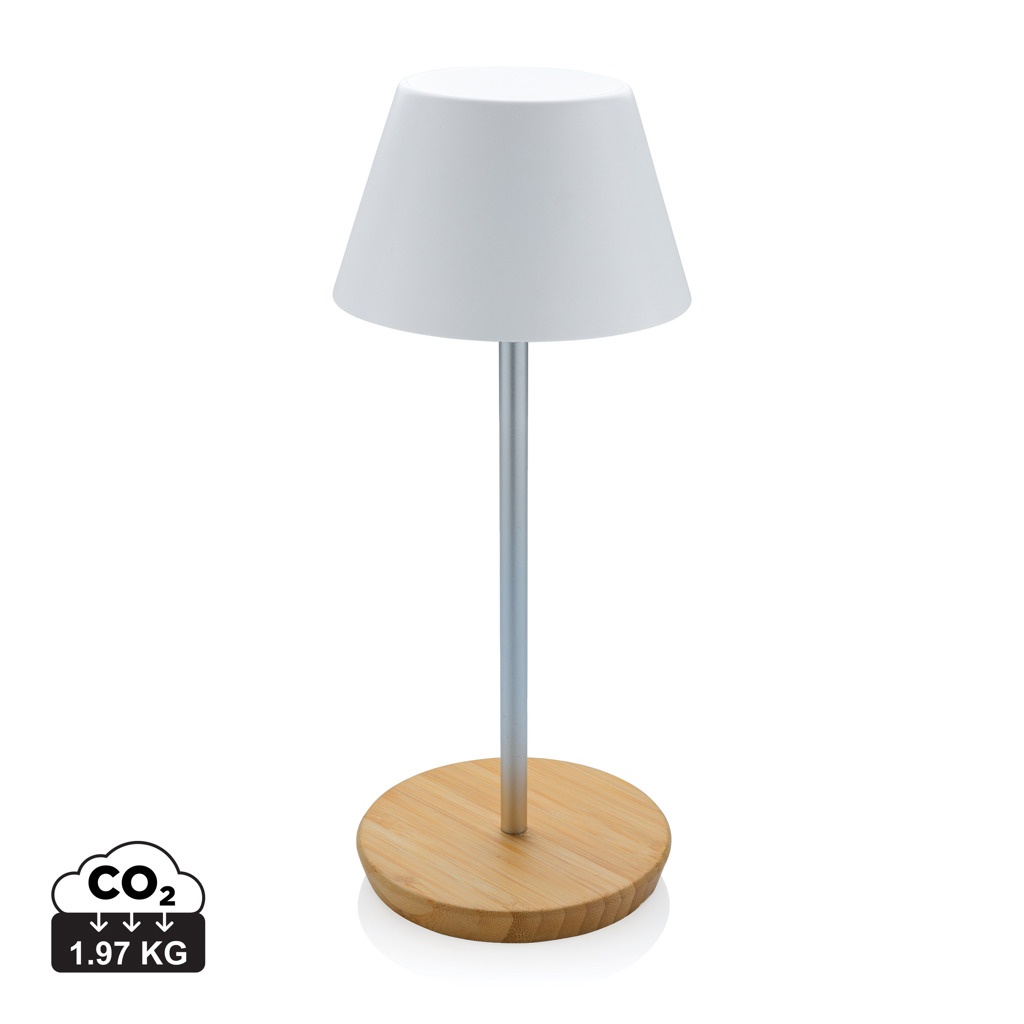 Роскошная настольная лампа из переработанного АБС-пластика, переработанного алюминия и 100% бамбука, сертифицированного FSC. Общее содержание переработанных материалов: 40% от общего веса изделия. Сертификация RCS гарантирует полностью сертифицированную цепочку поставок переработанных материалов. Настольная лампа будет работать до 18 часов на одной зарядке и может быть перезаряжена за 2 часа. С аккумулятором класса А емкостью 1800 мАч и входом типа C (5 В/1 А) С двумя режимами (теплый свет и белый свет), которые можно регулировать с помощью сенсорного датчика в основании. Заряжается через USB-C. Упаковано в упаковку FSC® mix. Водонепроницаемость IPX 4.