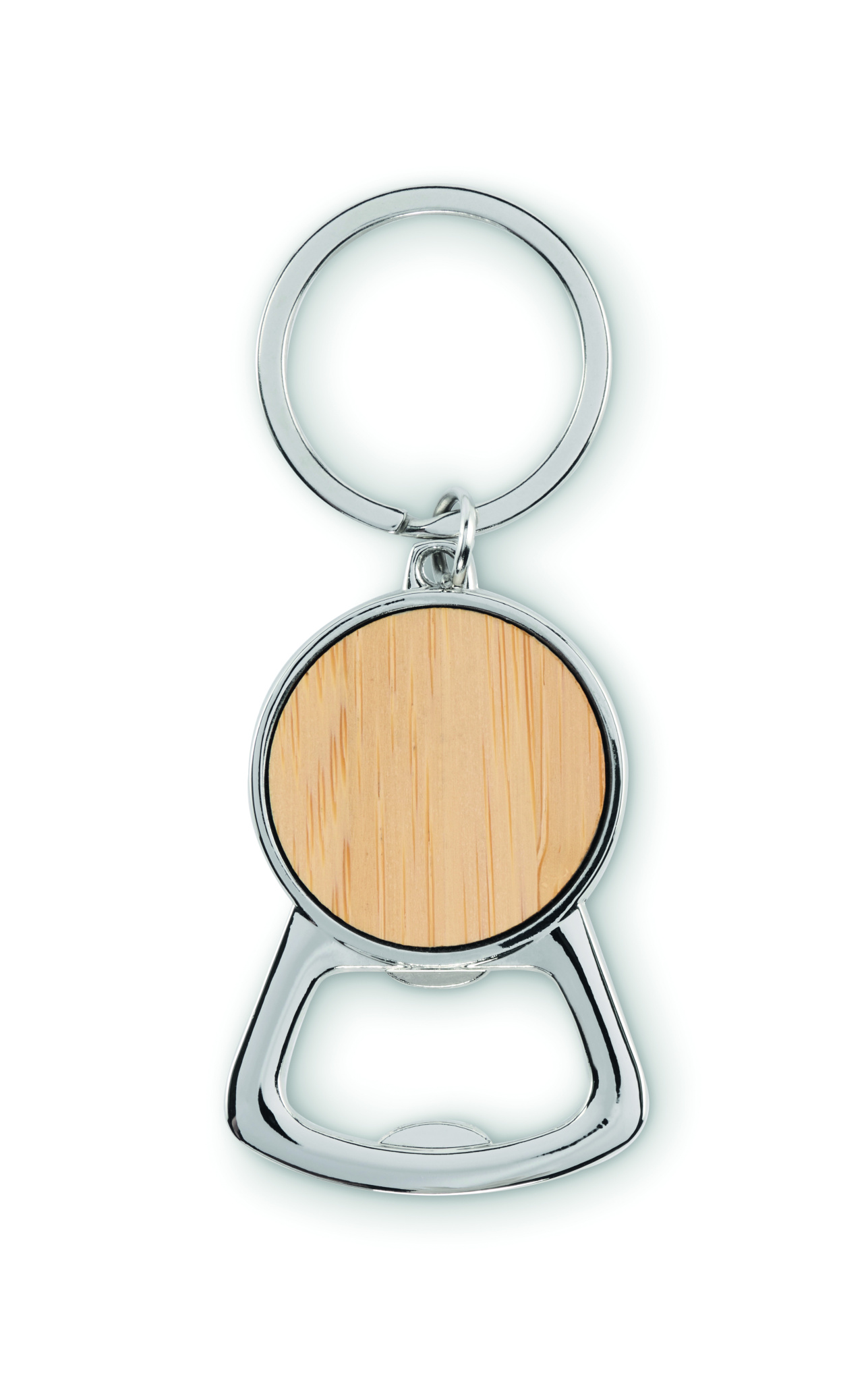 Metal bottle opener key ring with bamboo detail.