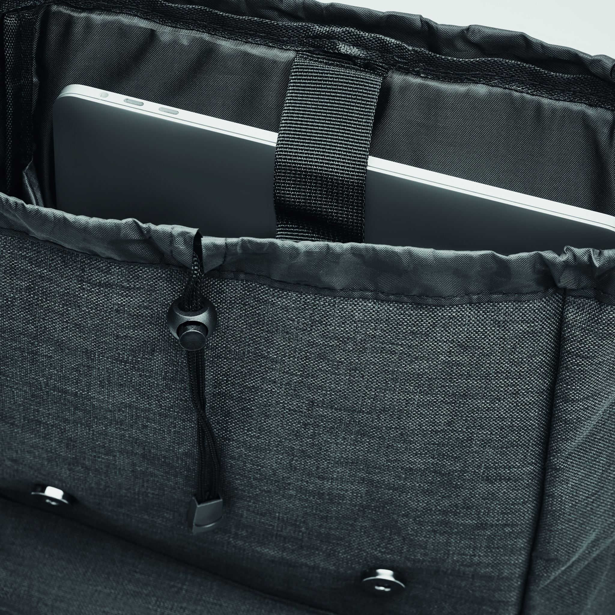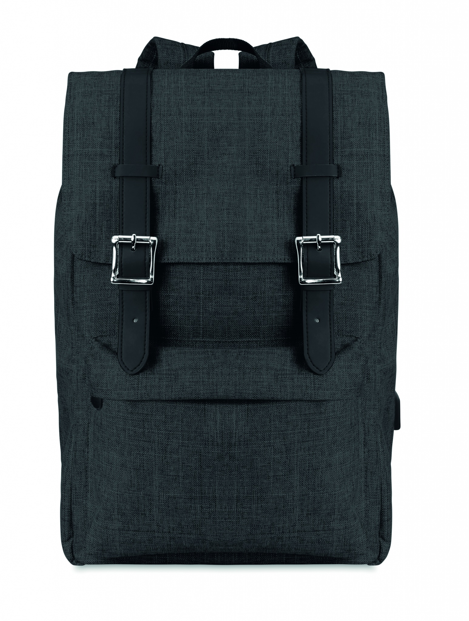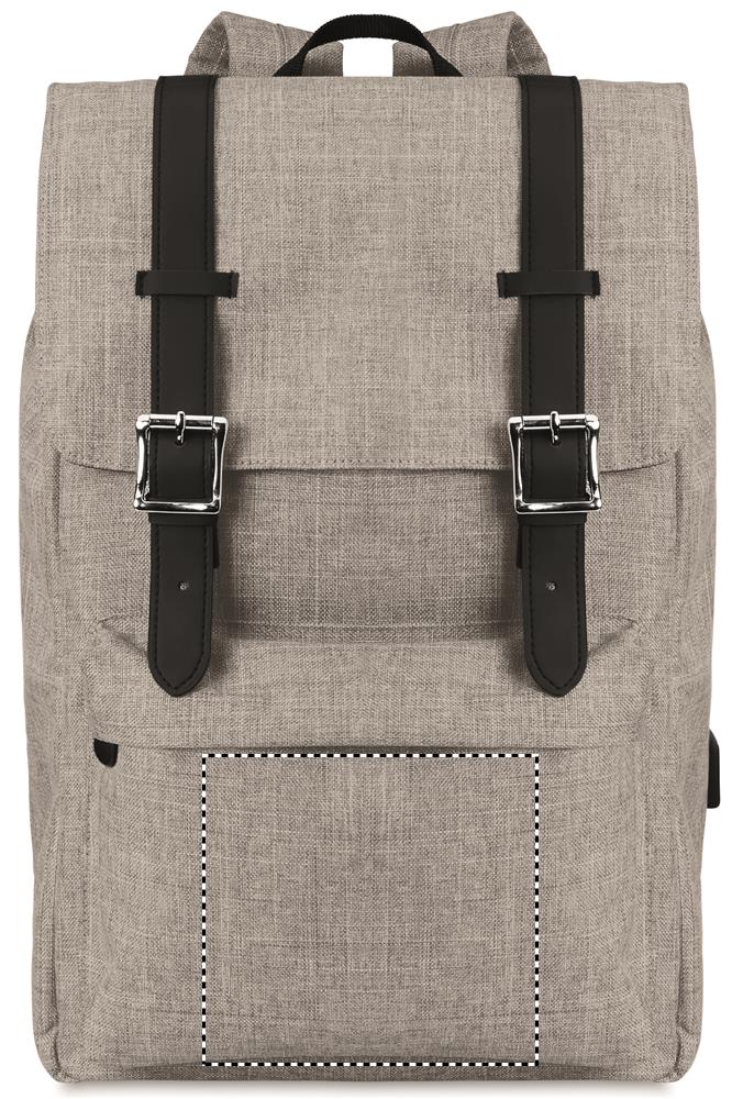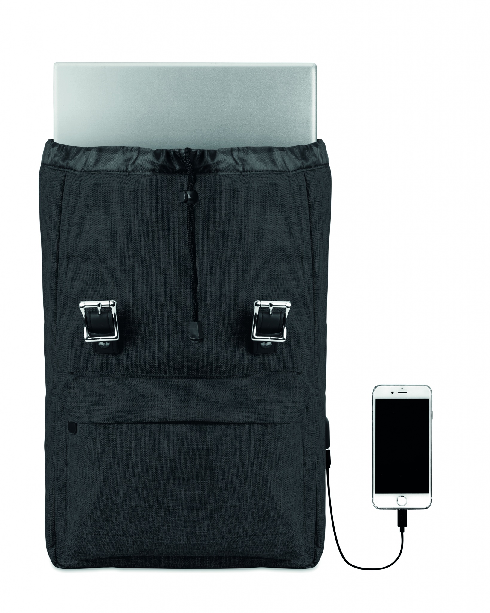 Рюкзак из полиэстера 600D с мягкими шлейками. Внутри 1 отделение для 15-дюймового ноутбука и USB-кабель для зарядки. Декоративные ремни закрываются на магните. Фронтальный карман на молнии.