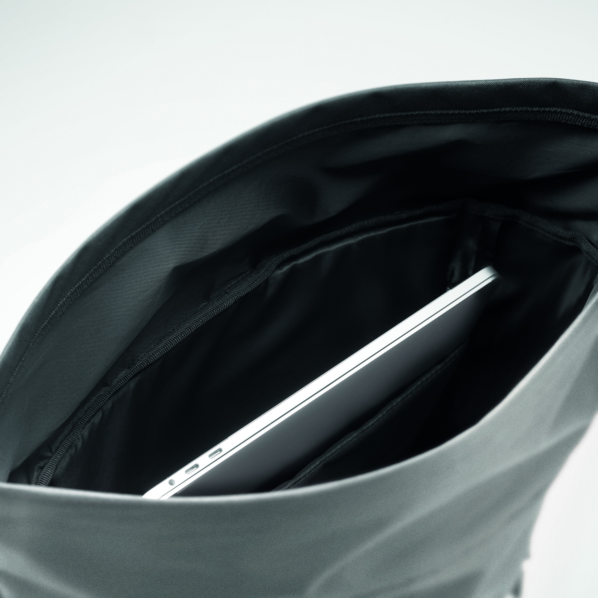 Рюкзак светоотражающий с отделением для ноутбука 15 дюймов из полиэстера 190T. Застежка rolltop. Спинка, лямки и дно с мягкой подкладкой. Передний боковой карман на молнии. Нижняя часть из переработанного полиэстера 600D.