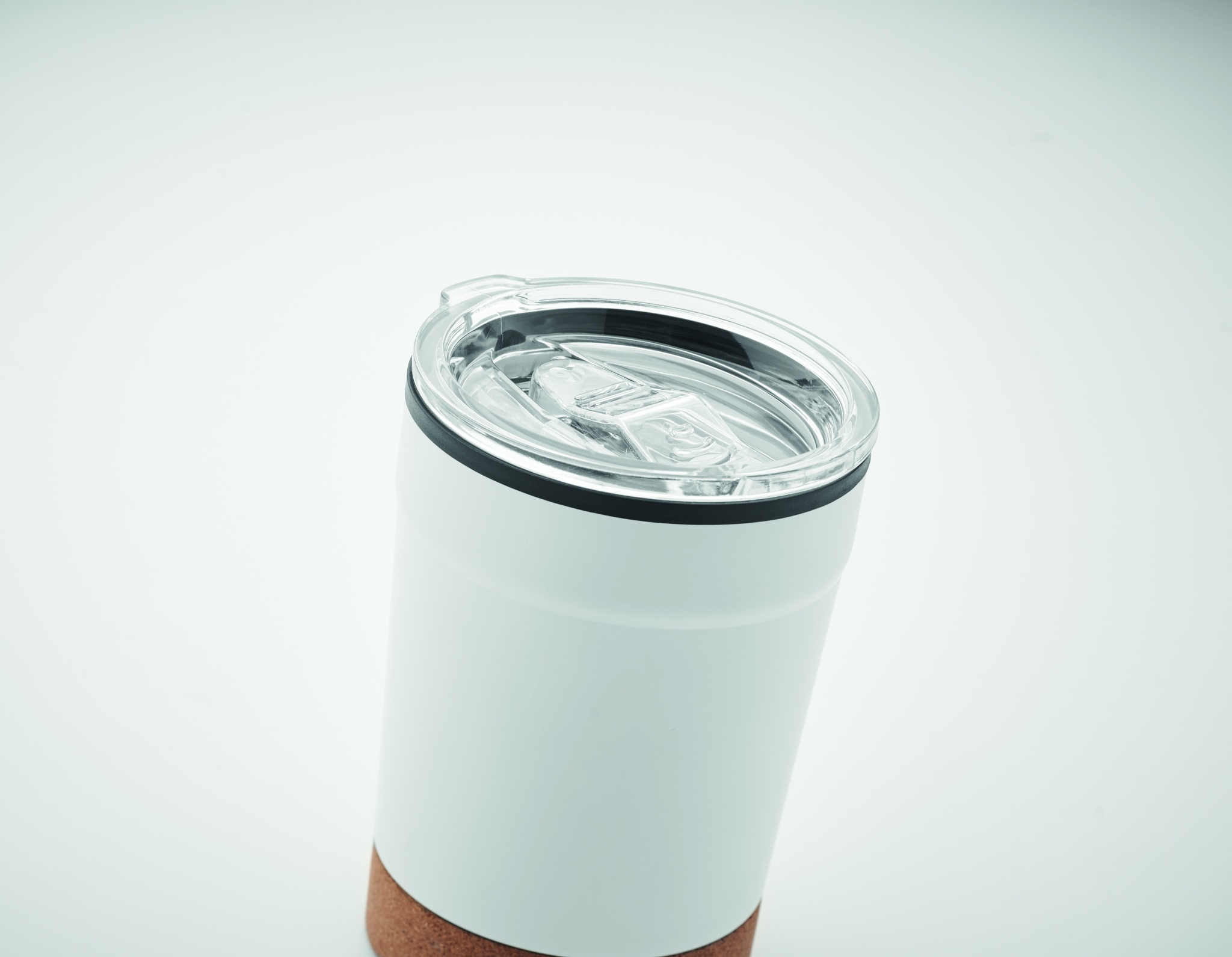 Термокружка с двойными стенками из нержавеющей стали снаружи и полипропилена внутри, пробковое дно и слайдер на крышке. Герметична. Объем: 300 мл.