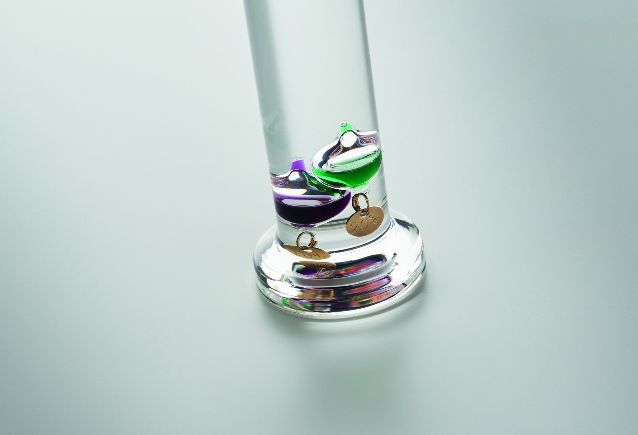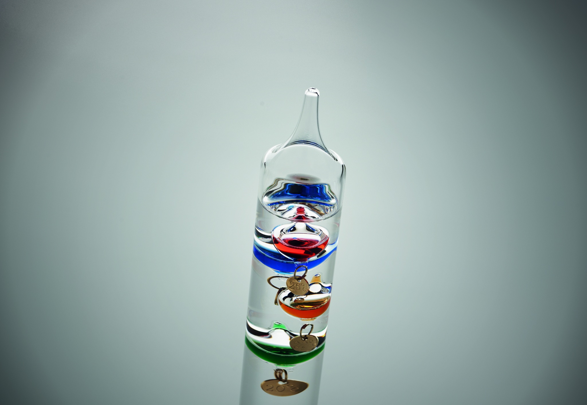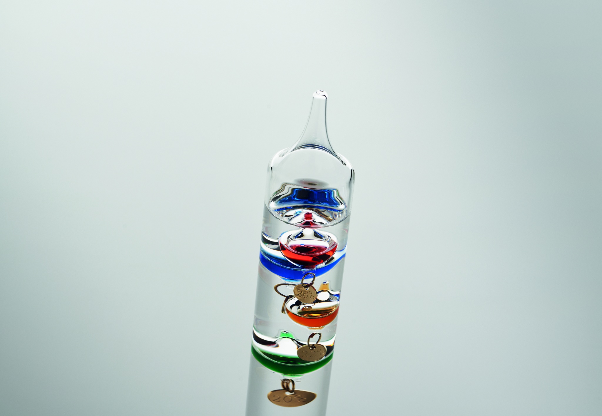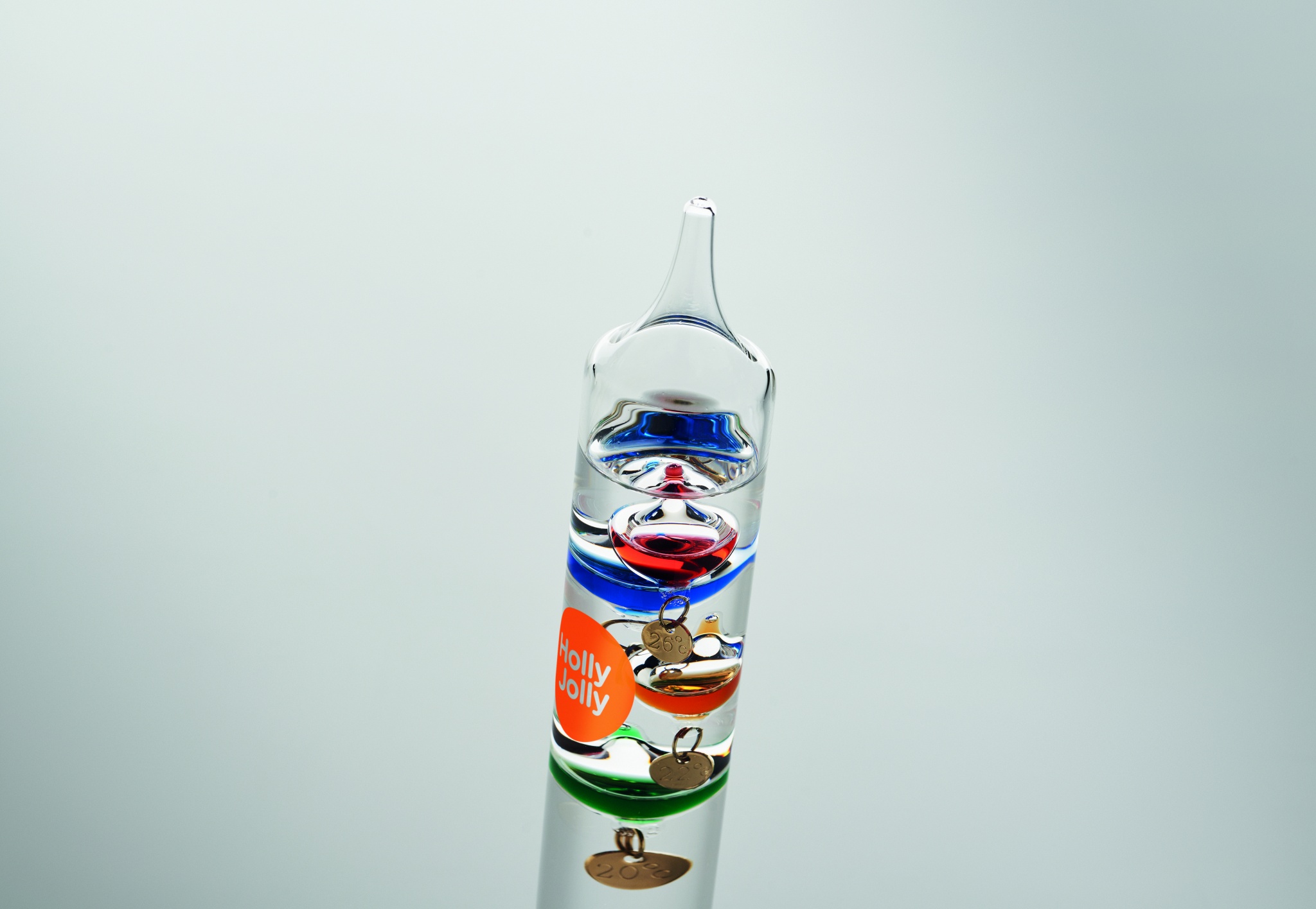 Стеклянный термометр Галилея с пятью цветными плавающими шариками. Каждый шарик показывает отдельную температуру от 18°c до 26°: Красный - 26°, Королевский синий - 24°, Оранжевый - 22°, Зеленый - 20° и Фиолетовый - 18°. Самый нижний шар в верхней группе показывает температуру окружающей среды.