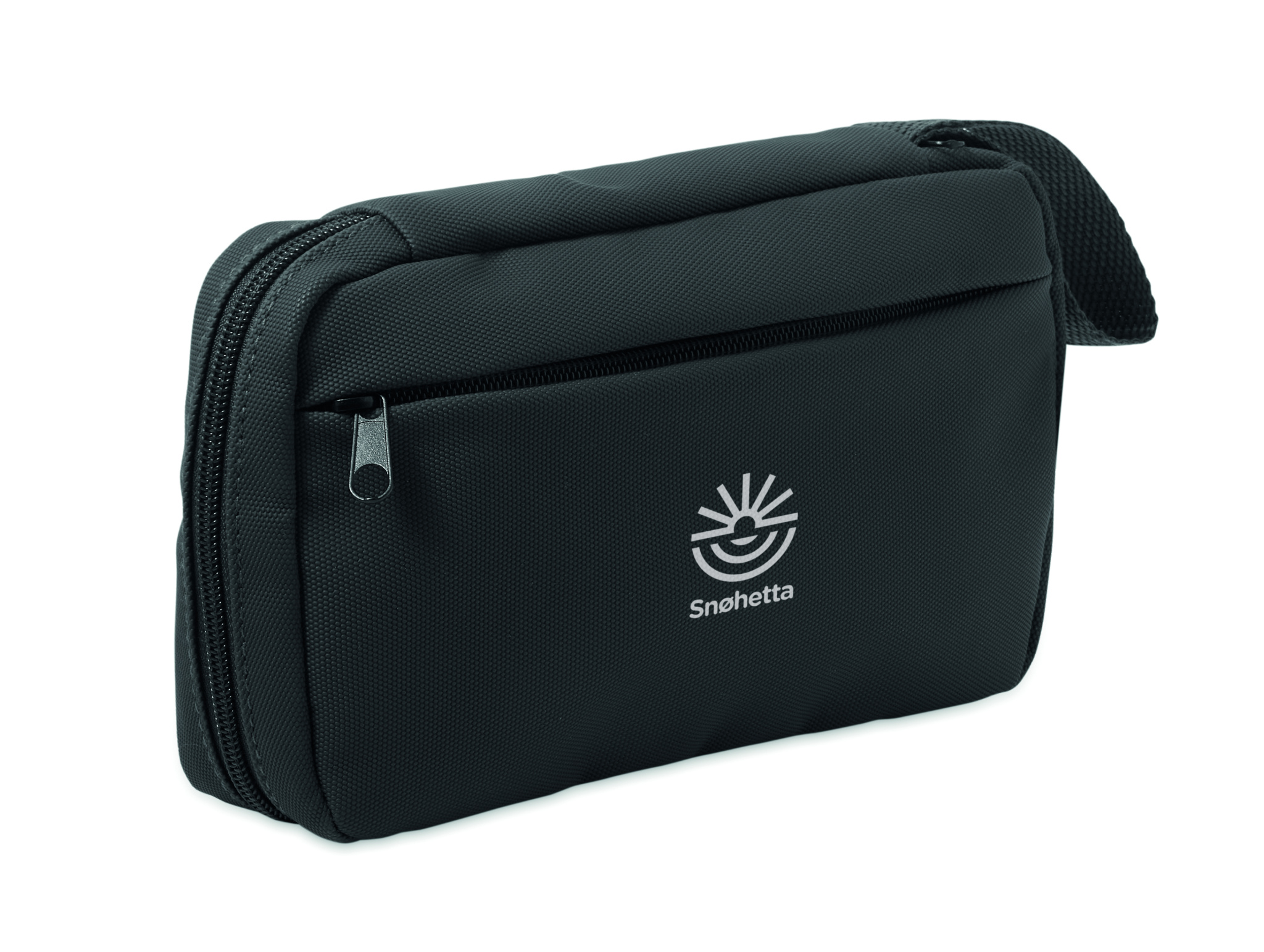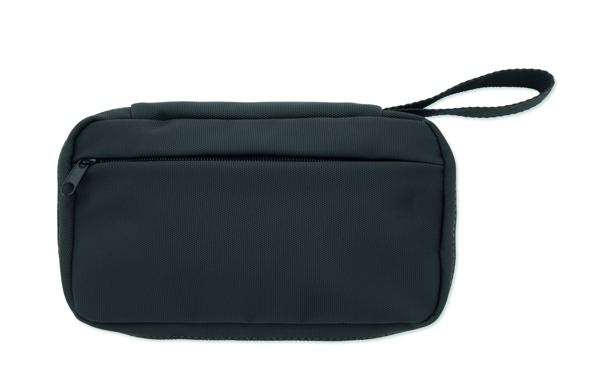 Toiletry bag in 600D RPET with PU coating, RPET mesh and 210D RPET lining. Features front zippered main compartment pocket, inner mesh and open pockets.