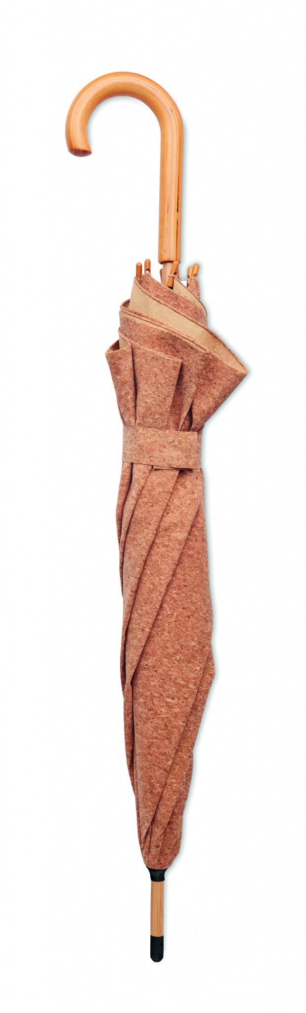 Пробковый зонт 25 дюймов с бамбуковым стержнем и деревянной ручкой, спицы из стекловолокна. Черные пластиковые наконечники и топ. Ручное закрытие.