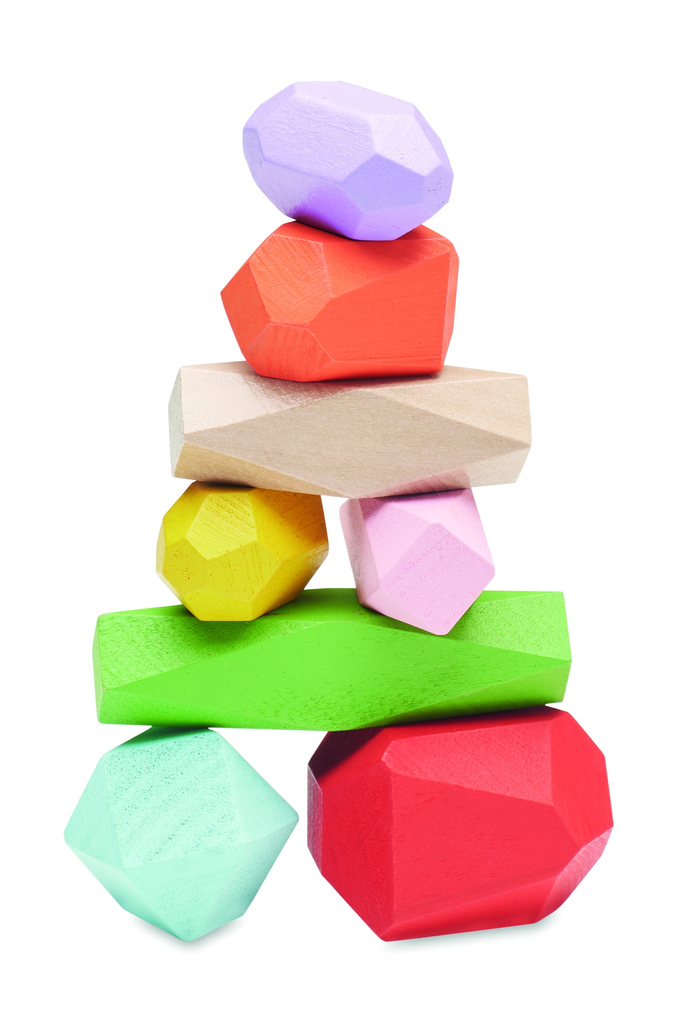 8 färgade stapelbara klossar i trä med en påse med dragsko av bomull.