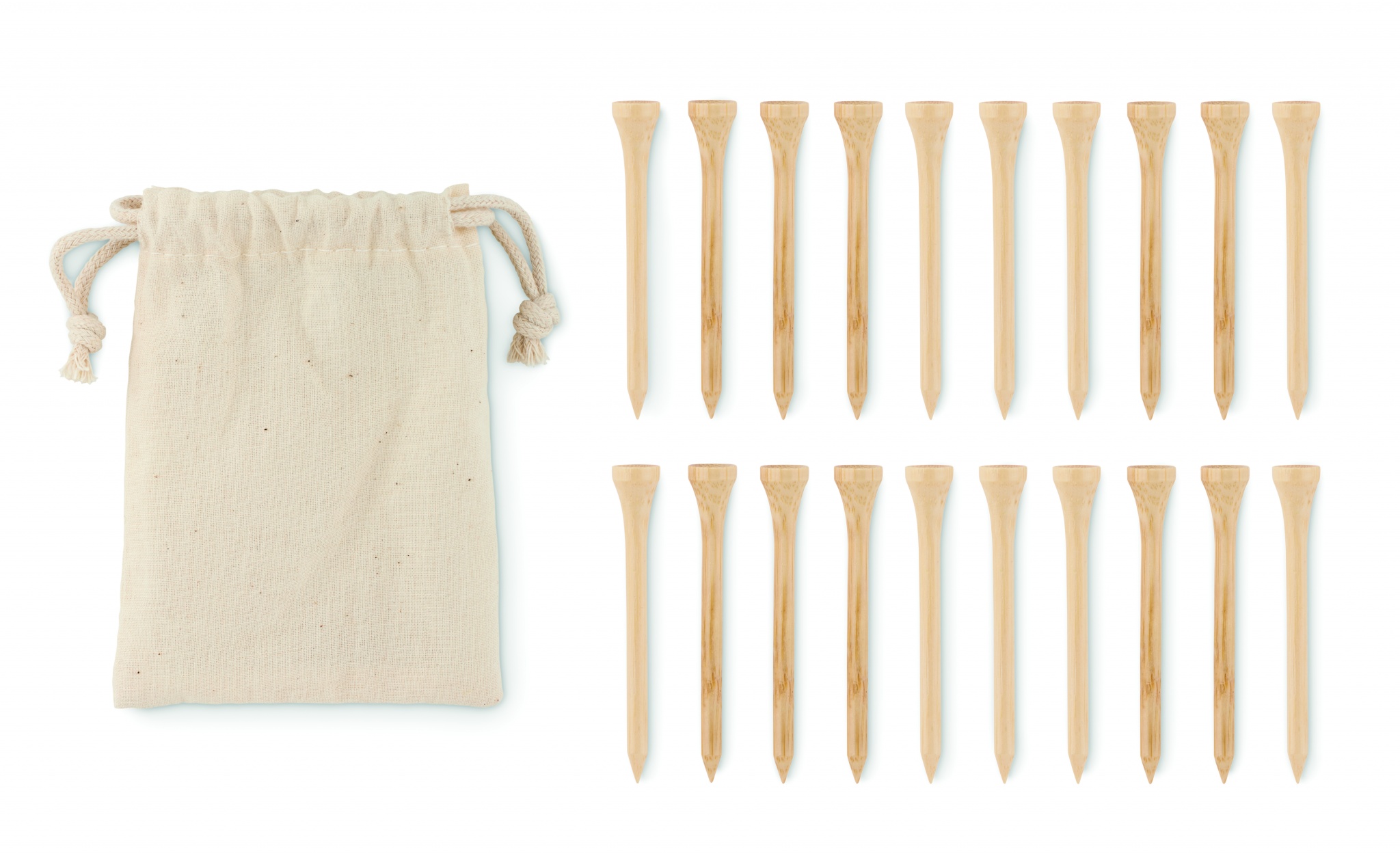 20st golfpeggar i bambu i en påse med dragsko i ekologisk bomull.