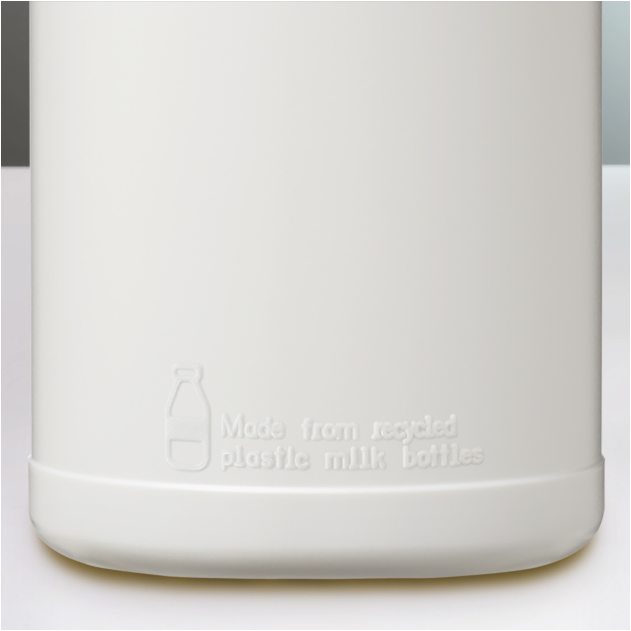 Sportflaskan med enkelvägg förvandlar engångsmjölkflaskor av plast till en produkt som kan användas om och om igen. Flaskan har ett spillsäkert lock som är uppfällbart och en kapacitet på 500 ml. Eftersom det rör sig om återvunnen plast kan färgnyanserna vara något varierande och det kan förekomma färgfläckar. Tillverkad i Storbritannien.