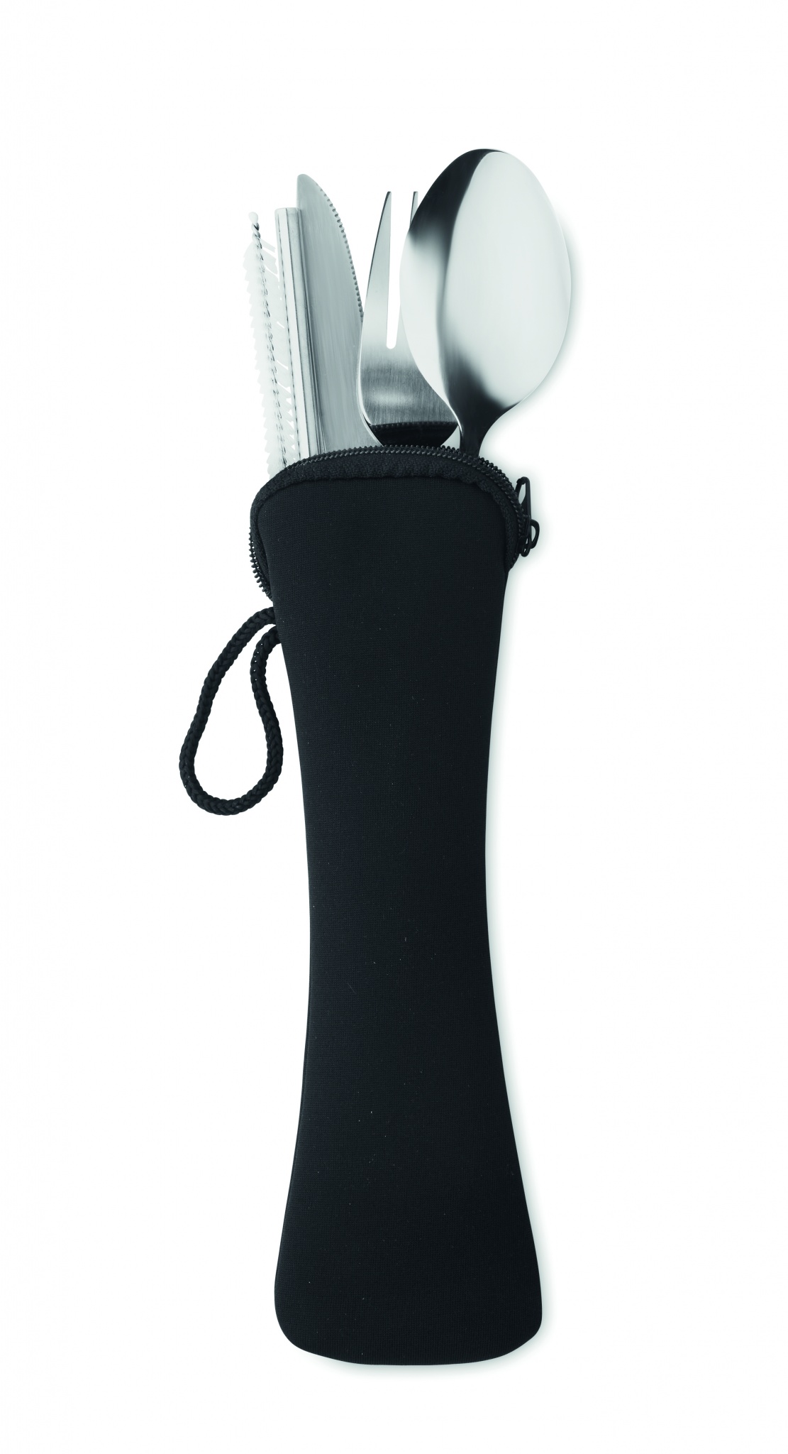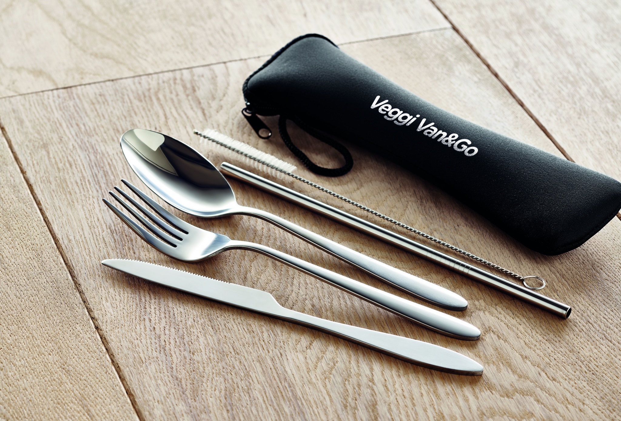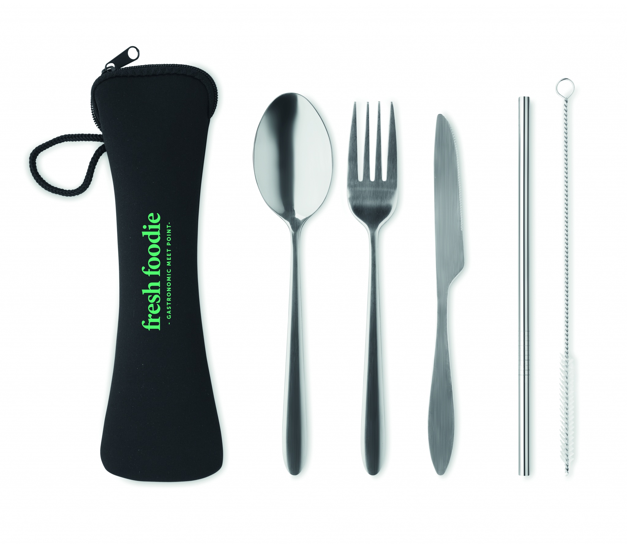 Bestick set av rostfritt stål inklusive gaffel, kniv, sked, sugrör och borste i neoprenpåse.