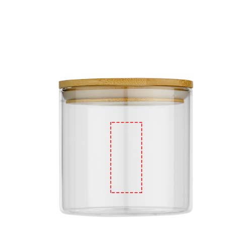 Liten matbehållare tillverkad av glas med bambulock. Den kombinerar fördelarna med glas som är ett säkert och hållbart material med de förnybara egenskaperna hos bambu. Glasbehållaren (utan lock) är mikrovågsugn- och maskindisksäker. Förpackad i en låda av återvunnet kraftpapper. Kapacitet: 320 ml.