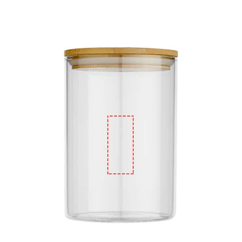 Medelstor matbehållare tillverkad av glas med bambulock. Den kombinerar fördelarna med glas som är ett säkert och hållbart material med de förnybara egenskaperna hos bambu. Glasbehållaren (utan lock) är mikrovågsugn- och maskindisksäker. Förpackad i en låda av återvunnet kraftpapper. Kapacitet: 550 ml.