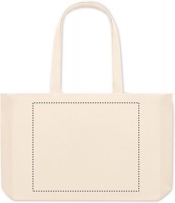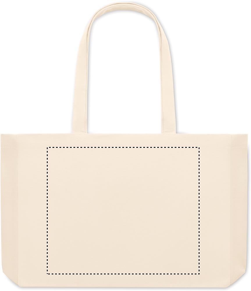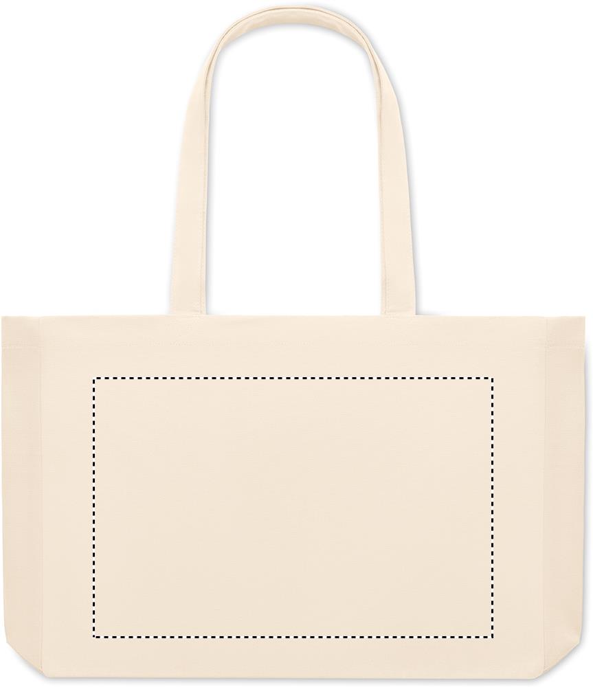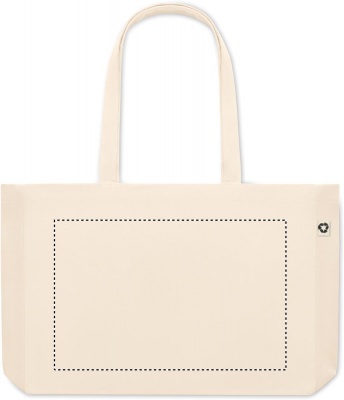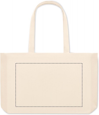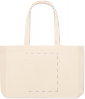 Tygkasse eller strandväska i naturfärgad canvas gjord av 50% bomull och 50% återvunnen bomull. Långa handtag och bälg. Kvalite: 280gr/m².
