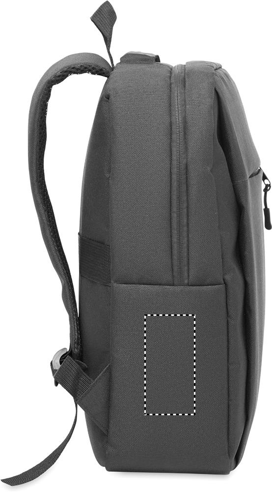 15'' dataryggsäck i 600D RPET-polyester och 210D-foder. Utvändig blixtlåsförsedd ficka för 10''-platta, 2 invändiga fickor. Ficka med dragkedja på framsidan. 2 sidofickor med dragkedja. Mjukt vadderade rygg- och axelremmar. Hållför resväska.