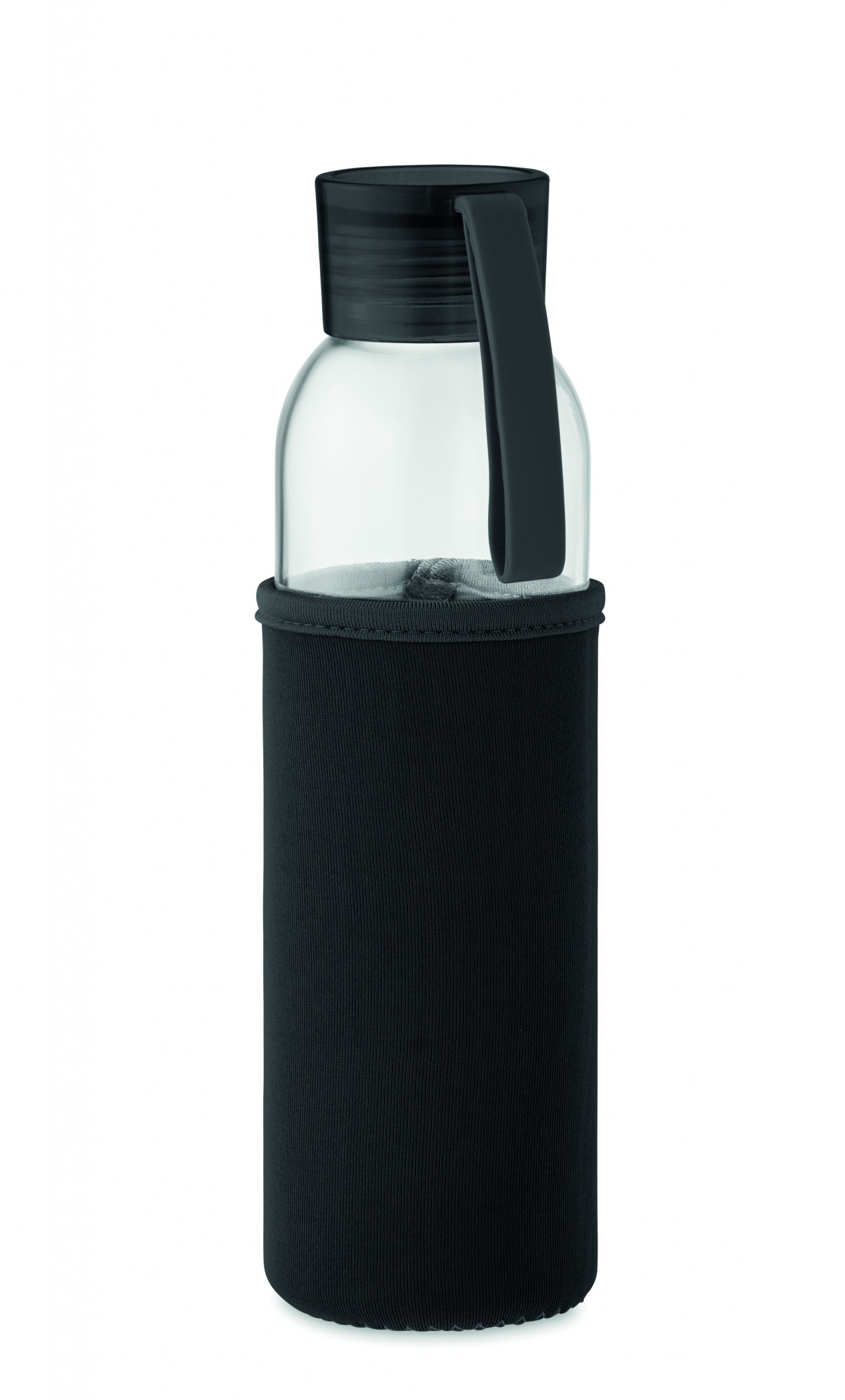 Glasflaska i återvunnet glas med neoprenpåse och PP-lock med silikonhängare. Läcker inte. Volym: 500ml.