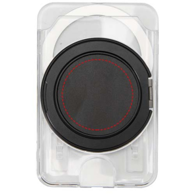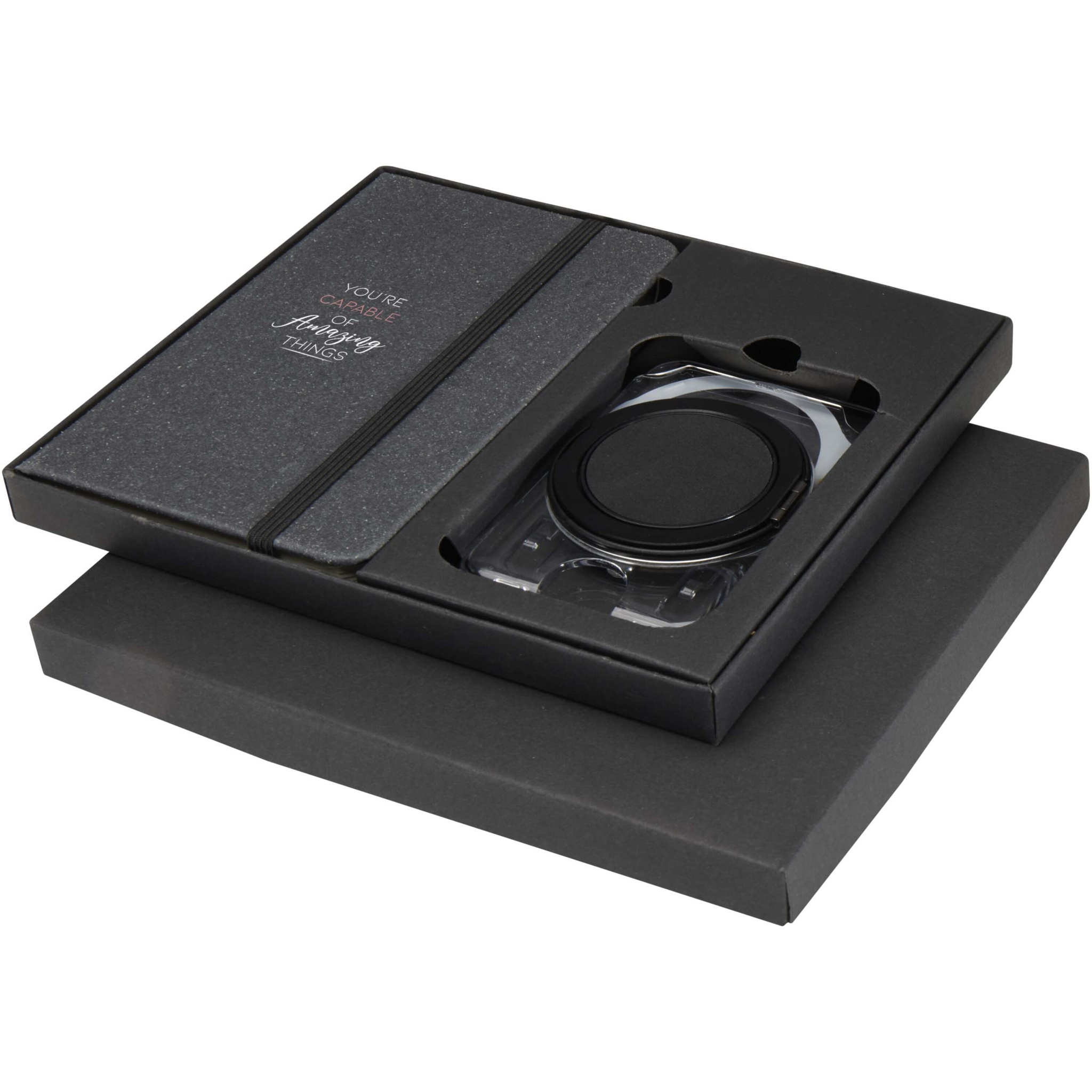 En praktisk presentförpackning med en A6-anteckningsbok och MagSafe-plånbok. Anteckningsboken har ett mörkgrått omslag av återvunnen plast, 80 linjerade krämfärgade ark av 70 g/m² papper och en svart elastisk förslutning. Den transparenta MagSafe-plånboken rymmer ett kort och fästs magnetiskt på iPhone 12 eller nyare modeller, och levereras även med en extra metallring för användning med andra telefoner. Båda artiklarna presenteras i en elegant presentförpackning av svart kartong.