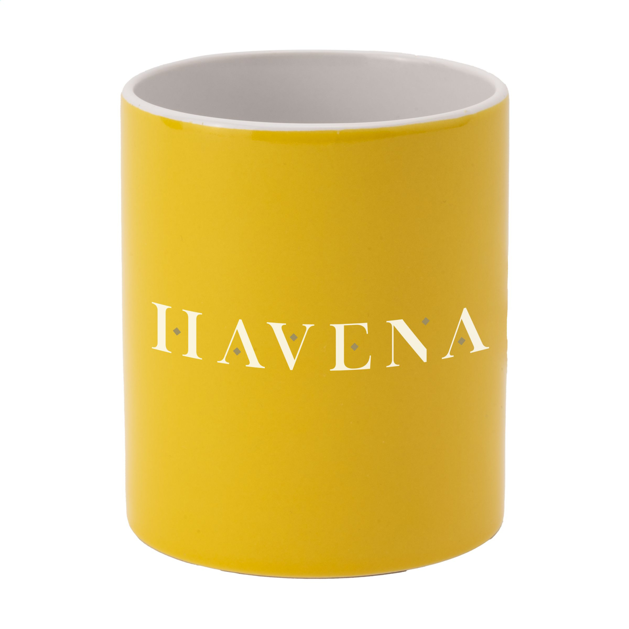 Högkvalitativ keramisk mugg. Helvit eller med färgad exteriör. Tål diskmaskin. Trycket är diskmaskinstestat och certifierat: EN 12875-2. Kapacitet 350 ml.
