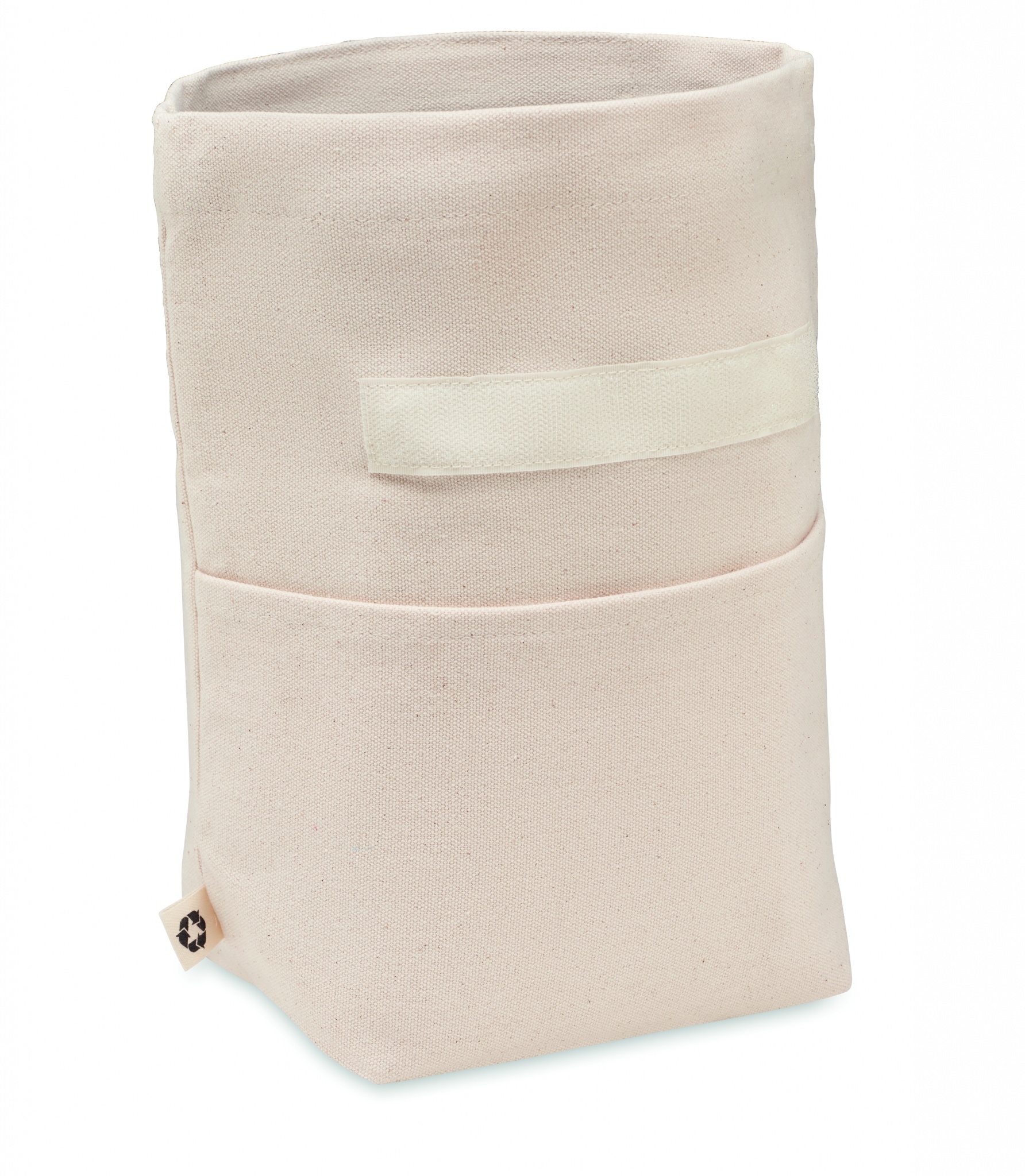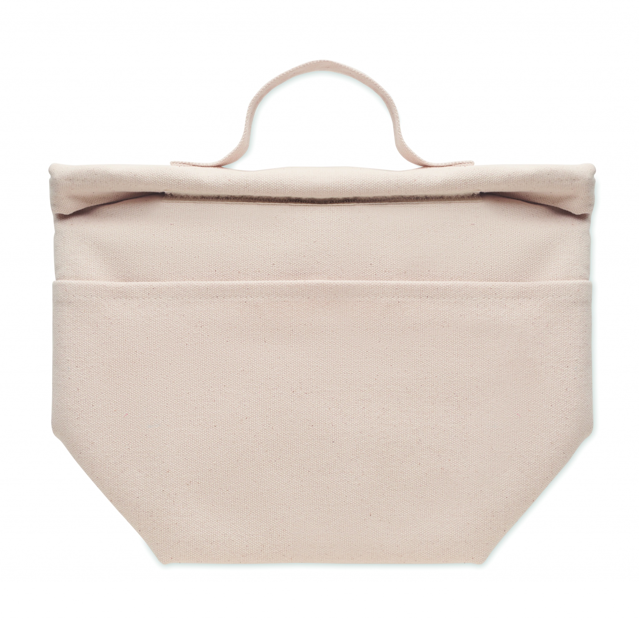 Isolerad kylväska i återvunnen bomull (70% återvunnen bomull, 30% RPET) med rullstängning med kardbporrelås. Isolering: 3 mm PE-skum med 12C PEVA.
