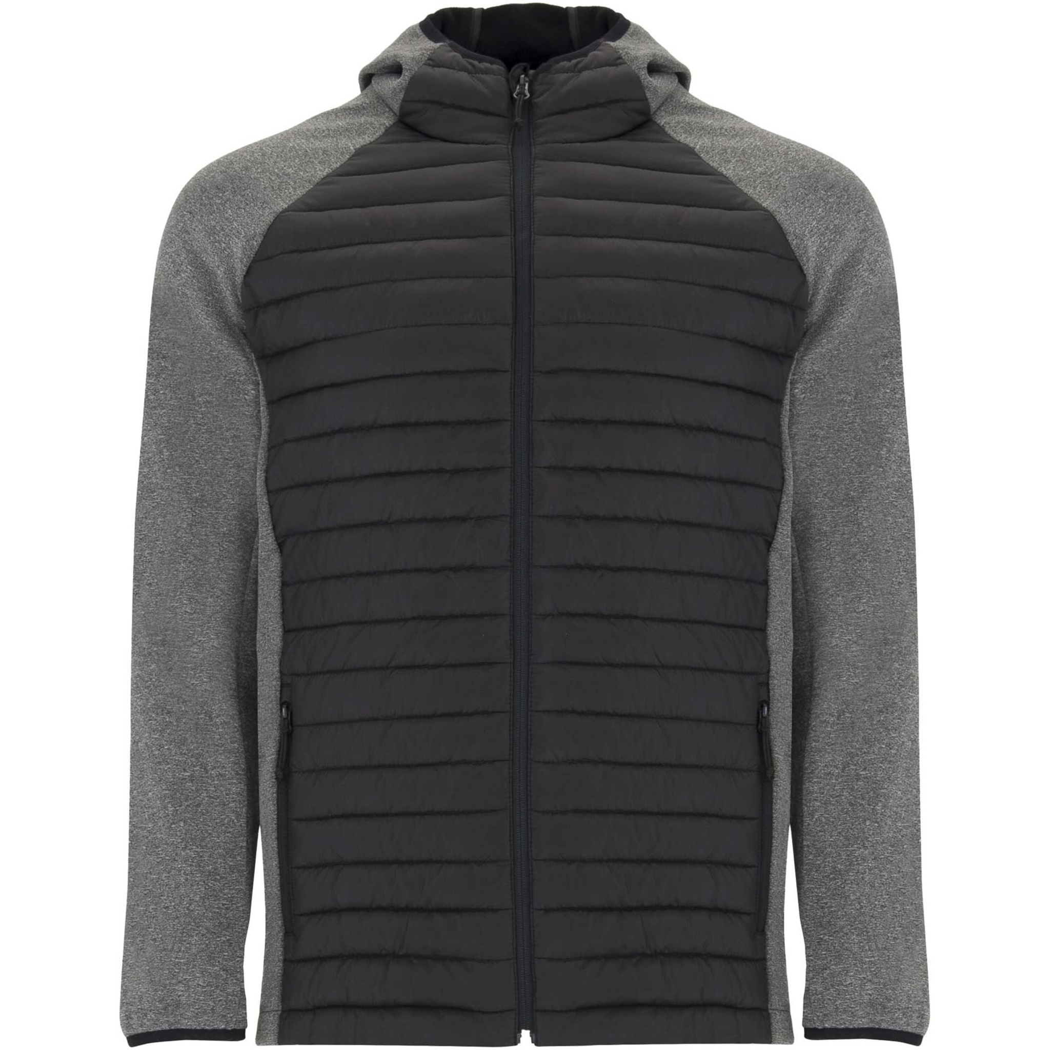Jacka unisex i två tyg med justerbar huva och raglanärm. Ärmar, sidodelar och huva i softshelltyg. Quiltat tyg med dunkänsla fram och bak. Omvänd dragkedja med matchande hakskydd och löpare. Två framfickor med dragkedjor. Matchande elastisk kant i krage, ärmslut och fåll. Borttagbar etikett. Vindtät modell. Den manliga modellen är 184 cm och bär storlek L, den kvinnliga modellen är 179 cm och bär storlek S.