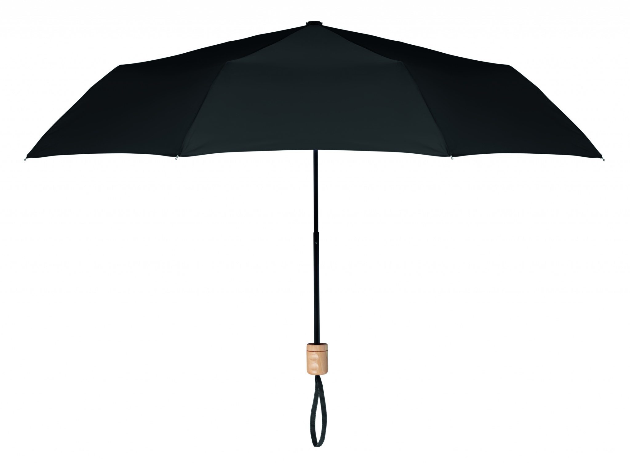 Kompaktparaply, 21 tum med 3 sektioner i exklusivt återvunnet RPET pongeetyg (190T), svartpläterad ram och ribbor. Handtag i trä. Manuell öppning och stängning. Inkl. matchande fodral.