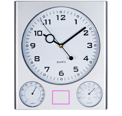 Elegant väggklocka med subtil vit urtavla och matt silveryta; visar tid, luftfuktighet och temperatur. Vi trycker din logotyp mellan hygro och termometer.