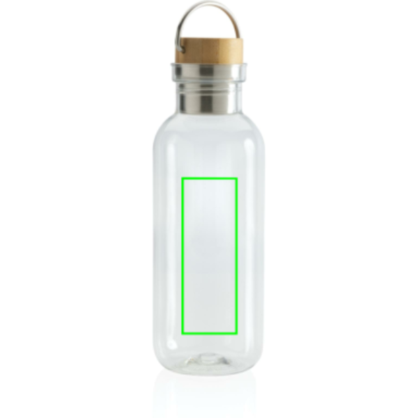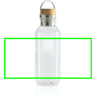 Enkelväggig RPET vattenflaska med ett stiligt lock i FSC-certifierad bambu. Flaskan har även ett smidigt bärhandtag. Flaskkroppen är tillverkad av 100% RCS certifierad RPET. RCS certifiering säkerställer en helt certifierad leveranskedja av de återvunna materialen. Endast handdisk. Flaskan ska endast användas för kall dryck. Totalt återvunnet innehåll: 56% baserat på total produktvikt. BPA fri. Volym: 680ml. Levereras i FSC®-certifierad kraft förpackning.