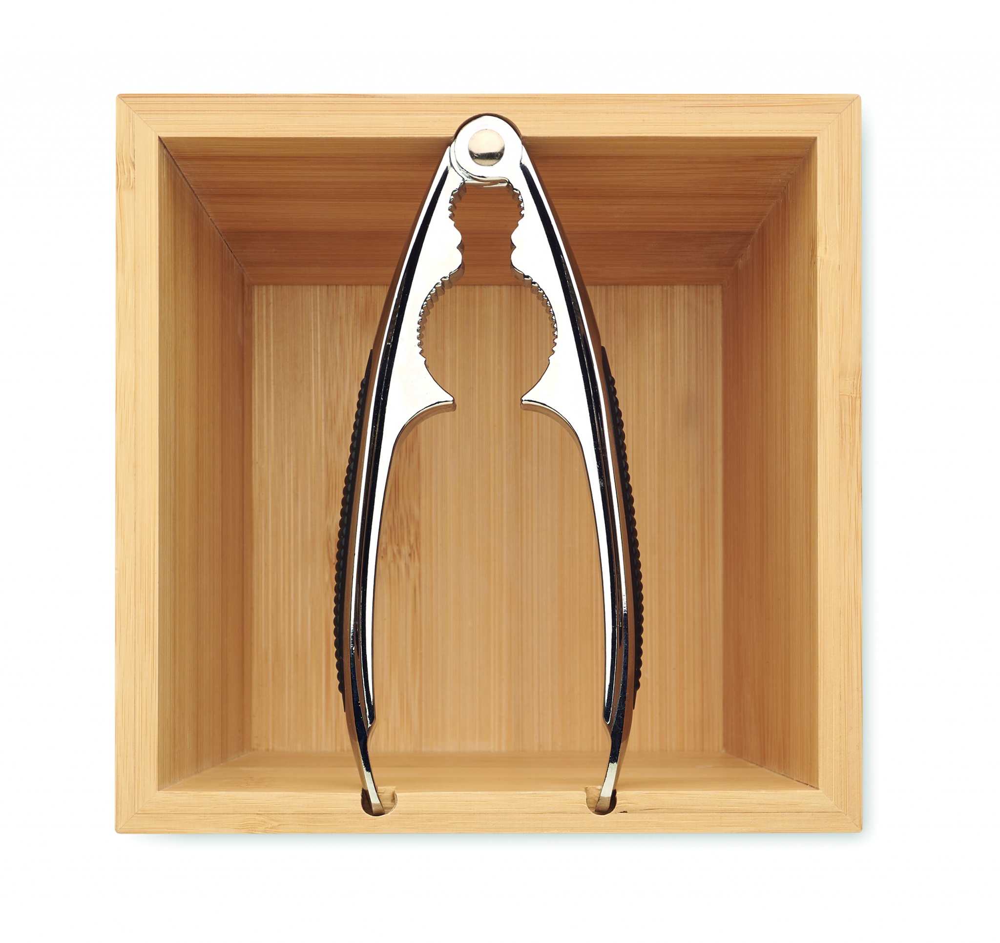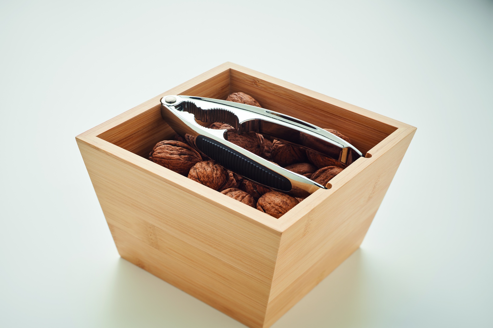 Nötset med bambuskål och silverfärgad nötknäppare i zinklegering med TPR-grepp.