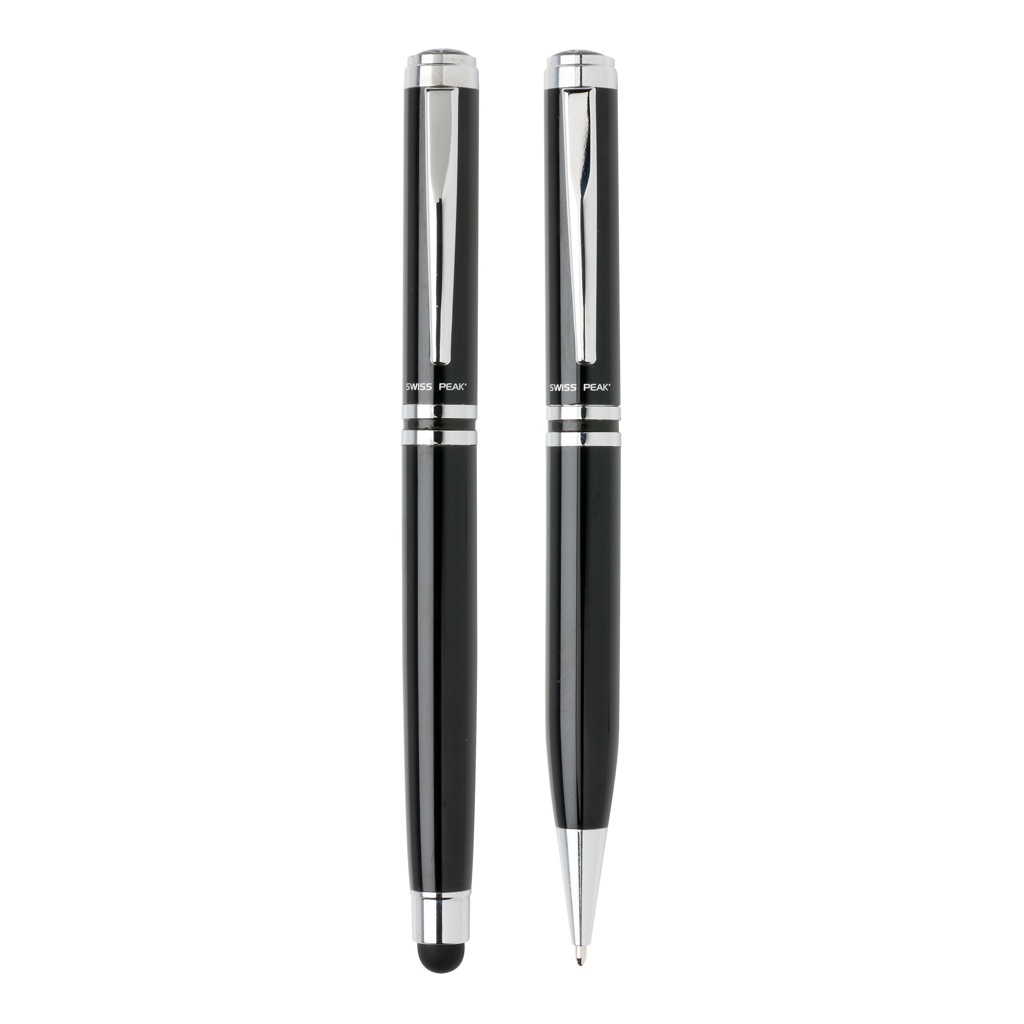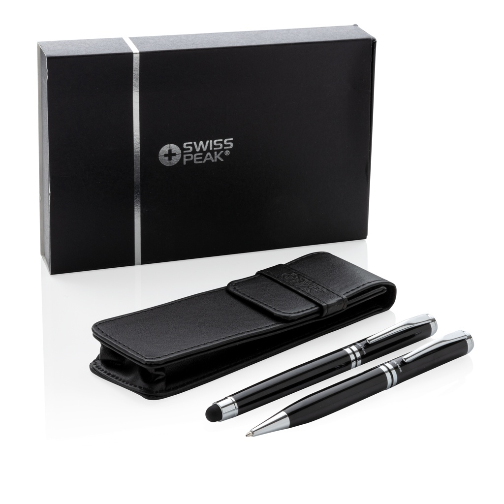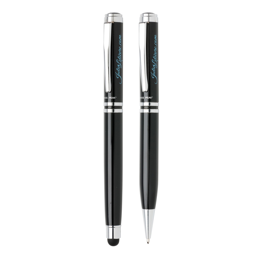 Ett riktigt kvalitativt pennset. En rollerball-penna i högkvalitativ mässing med stylusfunktion och en kulspetspenna med Swiss Peak logga. Förpackad i exklusivt PU-läder fodral och presentförpackning. Blått bläck.