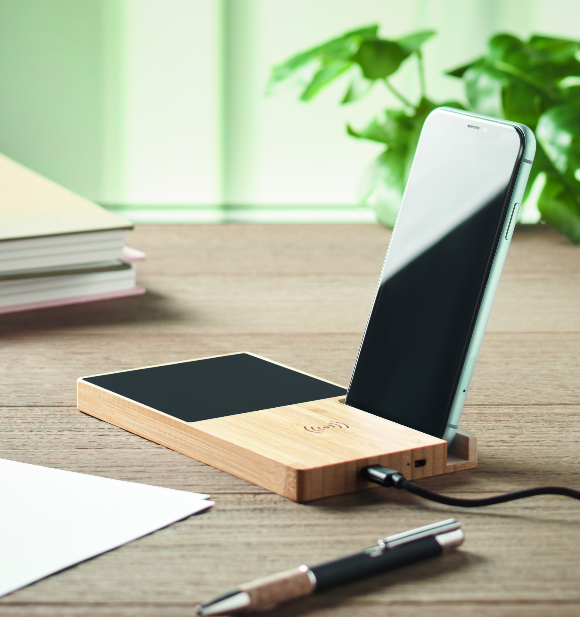 Trådlös laddare i bambu med mugghållare och telefonställ. Anslut enheten till din dator, placera din smartphone på den och låt den laddas. Utgång: DC 9V/1,67A (15W). Kompatibel med senaste Androids, iPhone® 12, X och nyare.