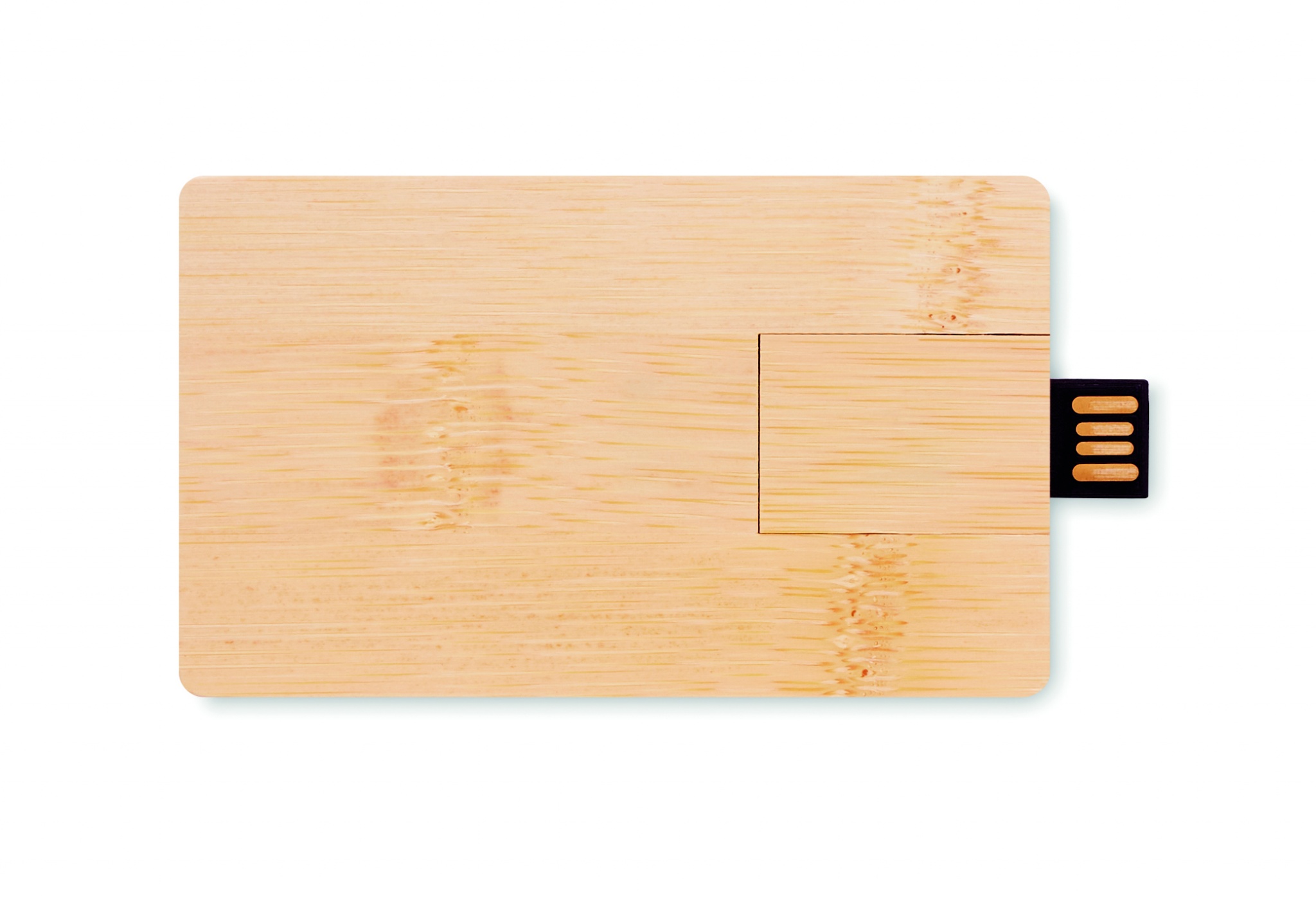 16GB USB 2.0 minne med hölje bambu i storlek med ett kreditkort. Bambu är ett naturligt material och kan därför skilja sig åt vilket kan ge små skillnader på märkningen.